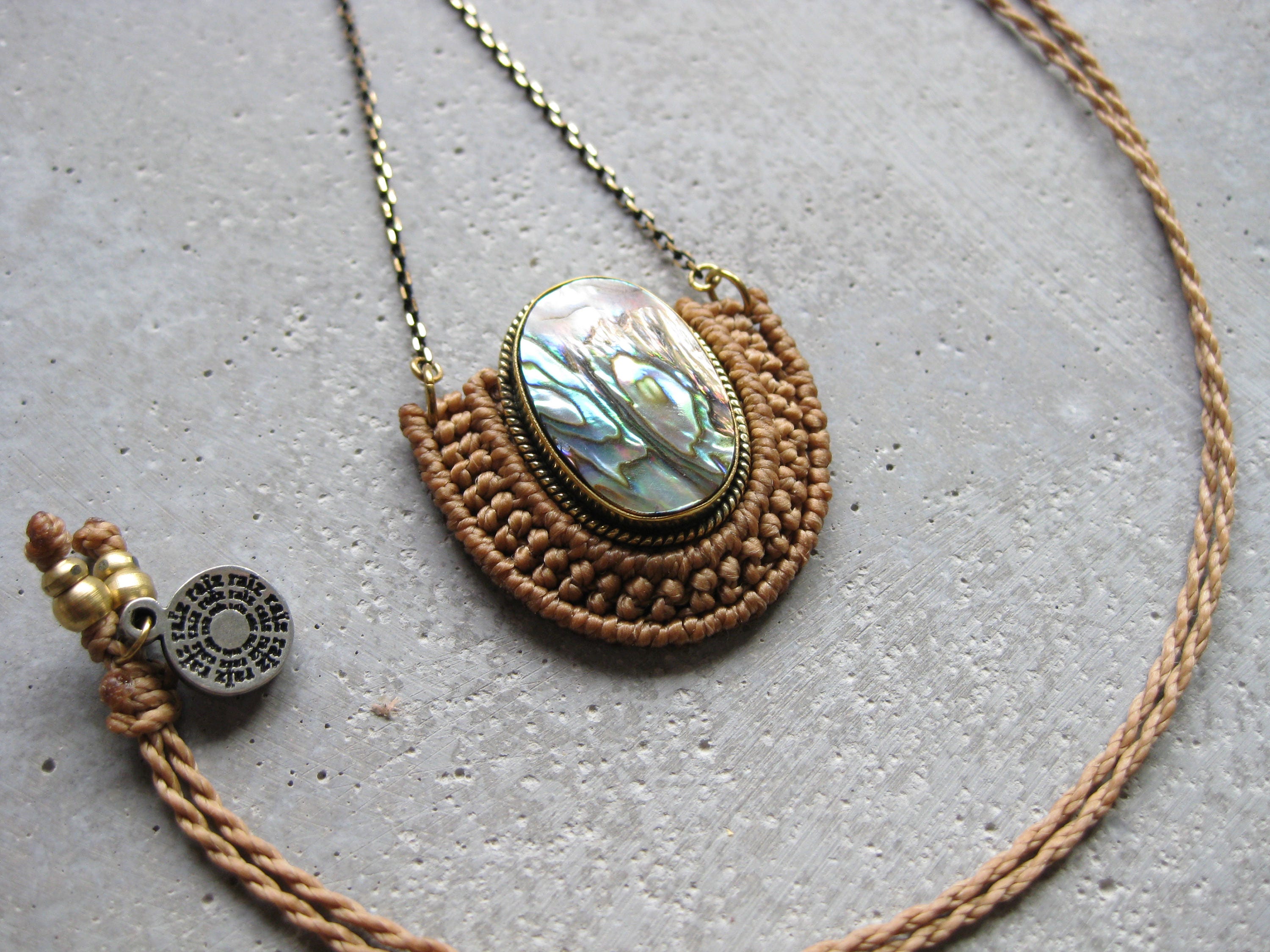 Modern minimalist chic necklace with Abalone set in brass and tan fiber micro macrame design.